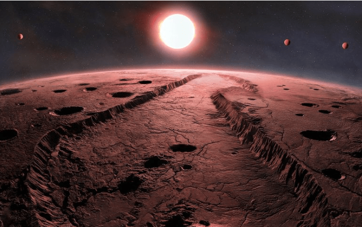 This artist’s concept pictures the planets orbiting Barnard’s Star, as seen from close to the surface of one of them.